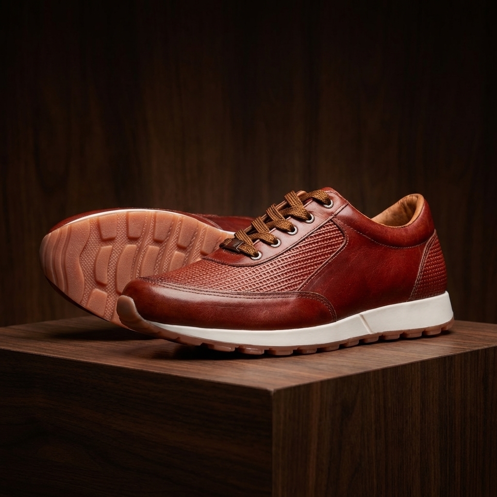 Fabricados en cuero premium coñac con diseño labrado de alto detalle, este modelo aporta textura, carácter y una estética diferenciadora que eleva el concepto del calzado deportivo tradicional hacia un nivel más elegante y exclusivo.